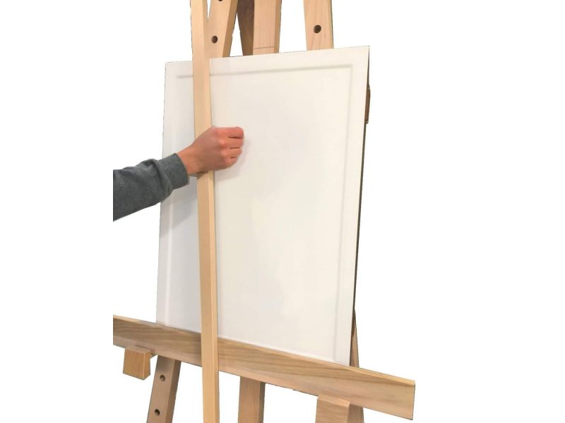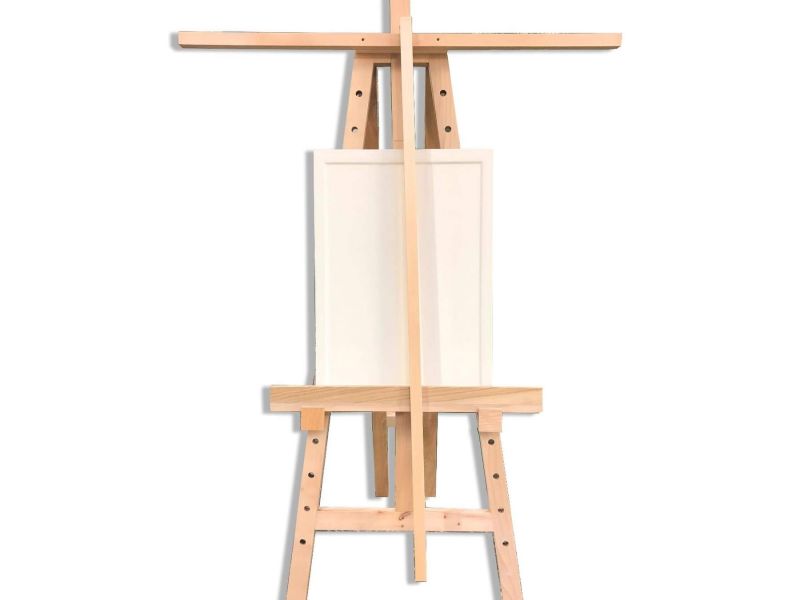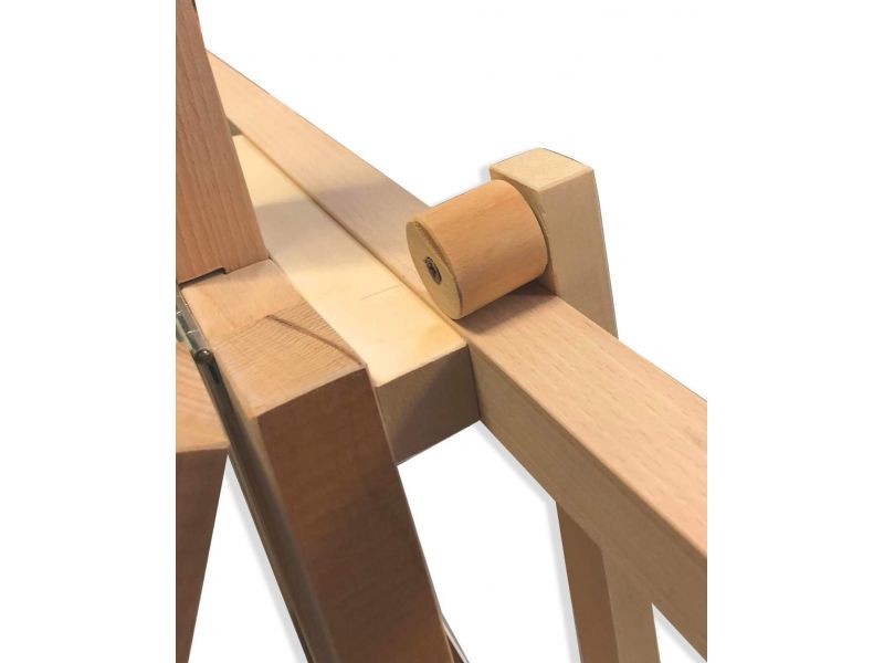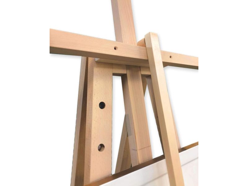 Caballete de estudio Dal Molin, fabricado en madera de haya. Es un caballete muy resistente y viene con un estante que se puede colocar a varias alturas. Los dos tablones verticales tienen orificios para introducir las clavijas que sujetan la estantería. La barra de soporte deslizante vertical, por otro lado, permite que la mano no se apoye sobre la pintura mientras se trabaja. El caballete es adecuado tanto para pizarras grandes como medianas y pequeñas.