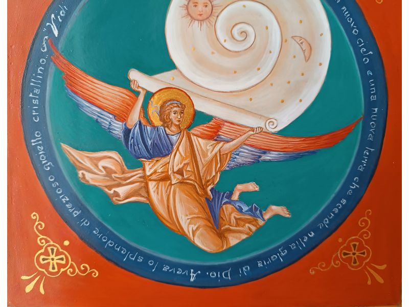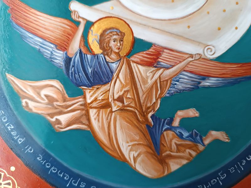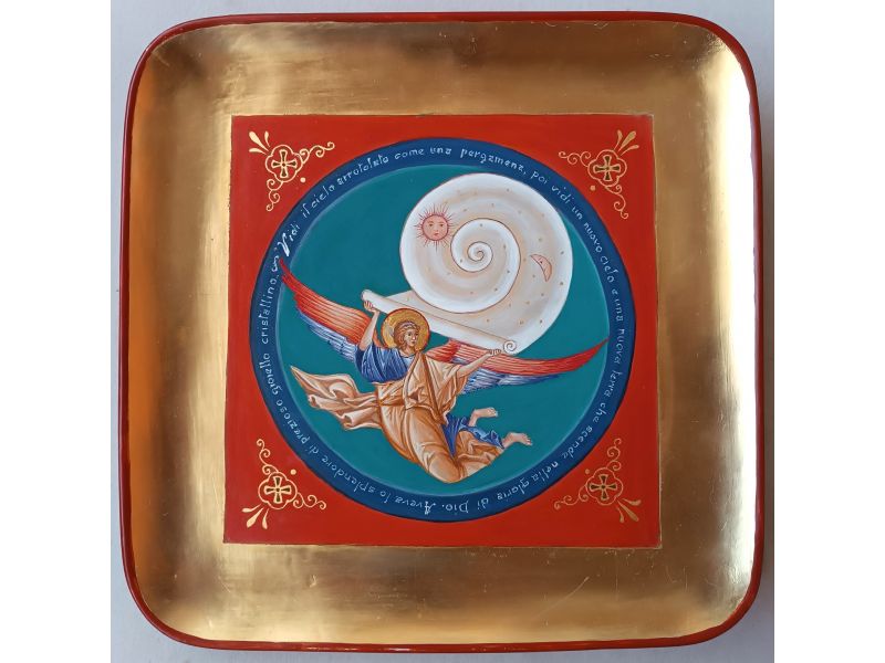 Icona Angelo con rotolo, 27,5x27,5 cm, su piatto di ceramica