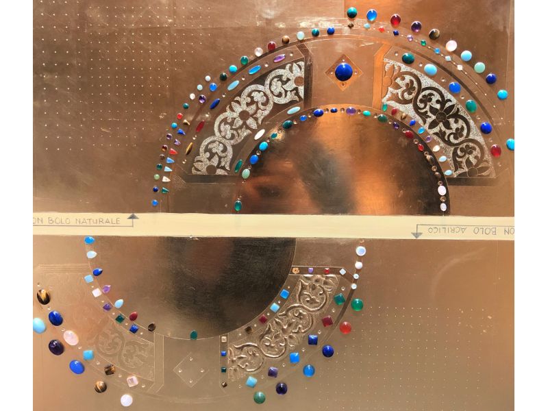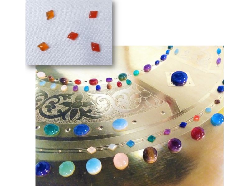 Gemme tutte naturali (non in pasta), lavorate e levigate in base alla forma, hanno un base piatta che consente un facile e veloce incollaggio con la missione all'acqua. Possono essere anche incassate, creando una cavità sul gesso.